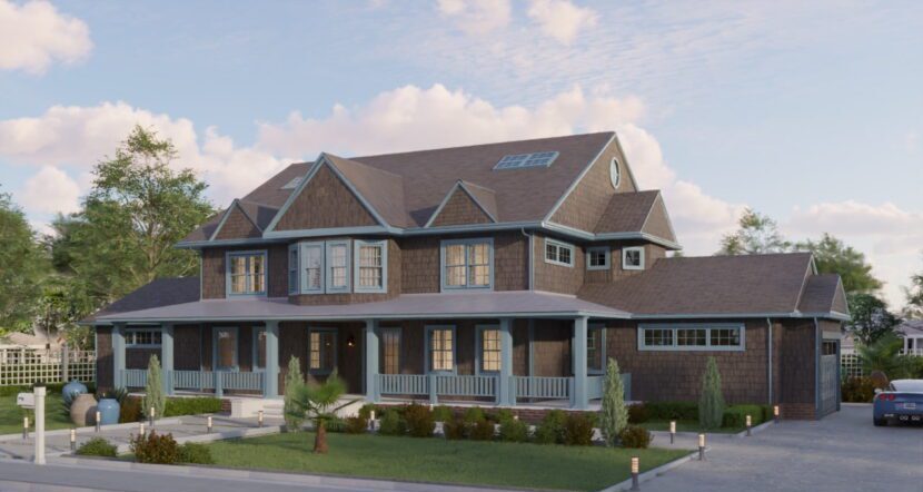 Drawing from Martha Stewart’s shingle-style home in East Hampton. Cedar shingles and stone anchoring set the exterior, with a clear gable rhythm and a long, horizontal massing. French doors and large openings connect the main rooms to terraces, with interiors finished in bleached oak, natural stone, and aged brass.